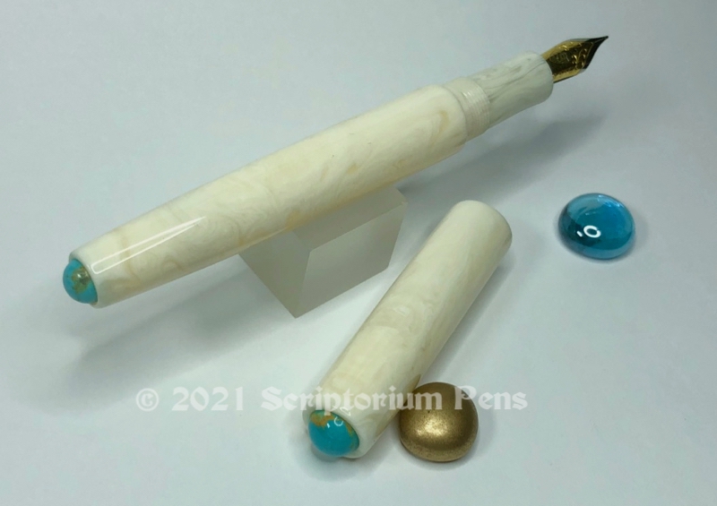 Lovingly Used Illuminaire in Ivory Lucite with American Mined™ Gold Canyon Turquoise Cabochons: Original price would have been $305. Used price: $190 + Shipping. Available with your choice of #6 JoWo Steel nib, tuned and smoothed by Mark Bacas, Nibgrinder. 18k nibs can be ordered for $135.