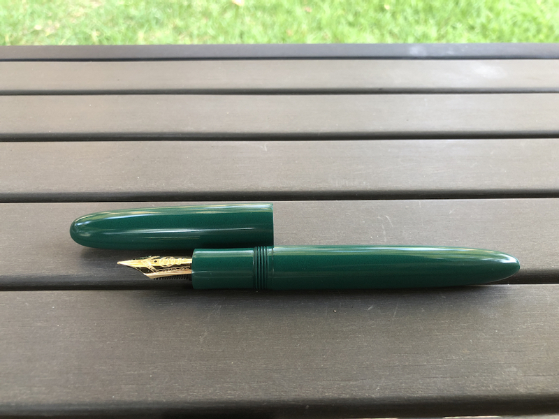Custom in Nikko Deep Green Ebonite – Large Published September 29, 2019 at 800 × 600 in Custom Sonneteer in Deep Green Nikko Ebonite with Bock #8 Nib Share this: Share on Mastodon (Opens in new window) Mastodon Email a link to a friend (Opens in new window) Email Print (Opens in new window) Print Like Loading...